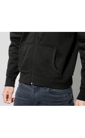 Sweat hooded jacket with high neck and full zip.