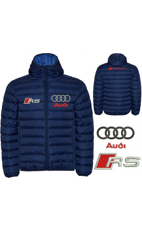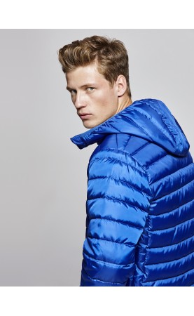 Men´s quilted jacket feathery to the touch with fitted hood. Embroidered Logos